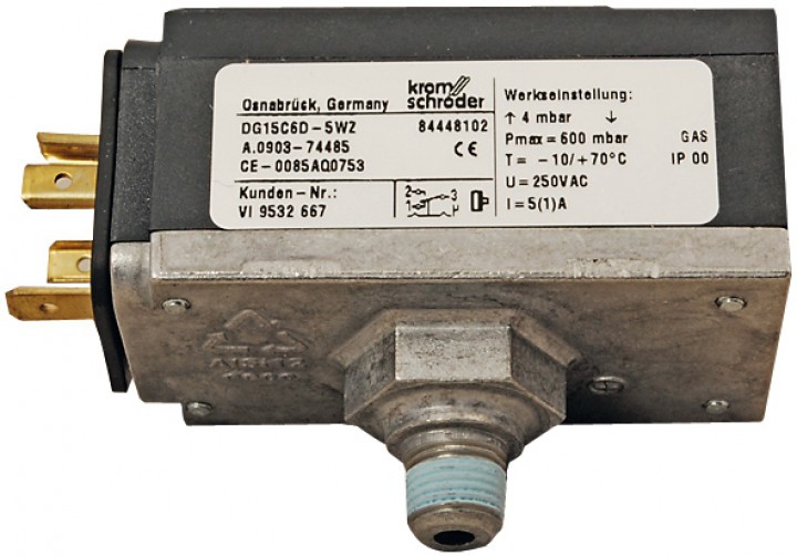 Для оснащения газовых котлов промышленного назначения и вентиляторов горелки реле давления KROMSCHRODER DG15C6D-5WZ. Прибор выполнен в соответствии с европейским стандартом EN 1854. Рабочей средой являются: воздух, природный, сжиженный (газообразное состояние) газ, биогаз, дымовые газы. Назначение – контроль нагнетательного давления.